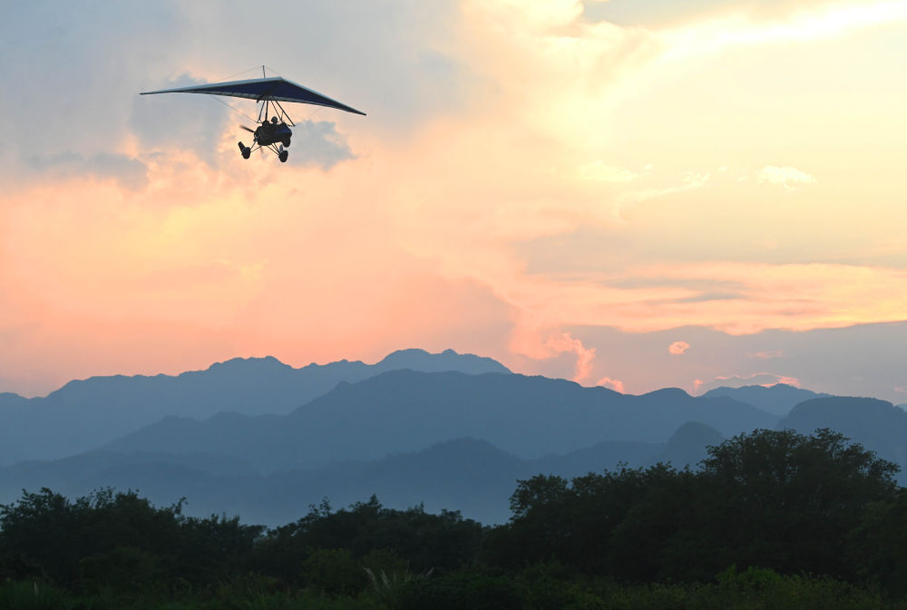 10月6日,游客在浙江省金華市武義縣大斗山飛行營地乘坐動(dòng)力三角翼。新華社發(fā)(張建成攝)