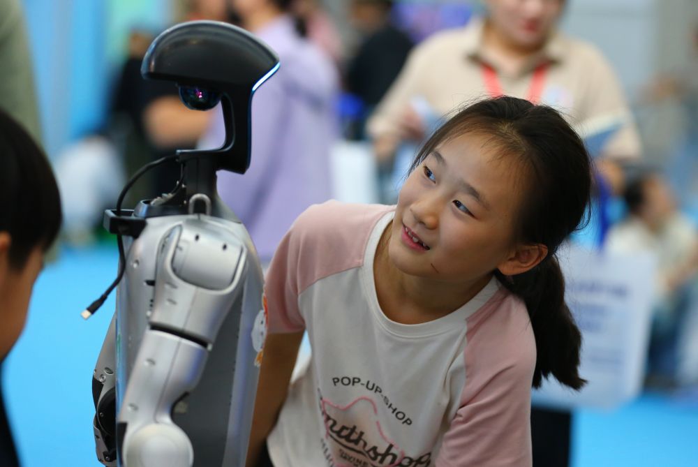 10月2日,在山東省第九屆滕州書展現(xiàn)場(chǎng),小朋友與機(jī)器人互動(dòng)。新華社發(fā)(李志軍攝)