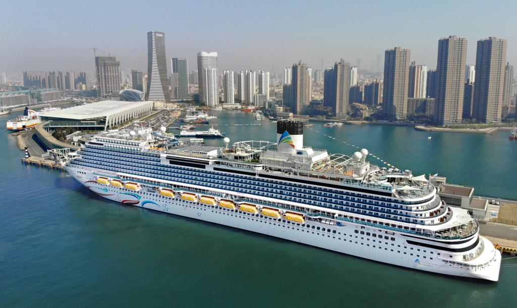 “愛達·魔都號”郵輪靠泊在青島郵輪母港碼頭(無人機照片)。新華社記者 李紫恒 攝