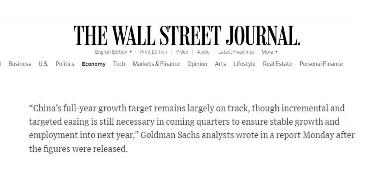 美國《華爾街日報》報道顯示,2023年前三季度中國GDP同比增長5.2%,意味著"5%左右"的年度增長目標(biāo)已基本達成。報道援引高盛分析師觀點稱,雖然未來幾個季度仍需實施漸進式、結(jié)構(gòu)性的寬松政策,但全年經(jīng)濟增速仍將總體符合預(yù)期。