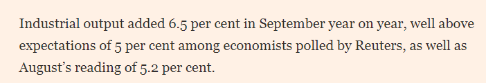 英國《金融時報》的文章分析說,9月規(guī)模以上工業(yè)增加值同比增長6.5%,顯著高于路透社調(diào)查經(jīng)濟學(xué)家預(yù)期的5%及8月的5.2%。荷蘭國際集團(ING)經(jīng)濟學(xué)家分析稱,超預(yù)期表現(xiàn)主要源于外需拉動。文章說,上周,海關(guān)數(shù)據(jù)顯示,中國出口保持韌性,9月同比增長8.3%,對東南亞等地區(qū)出口持續(xù)增長。