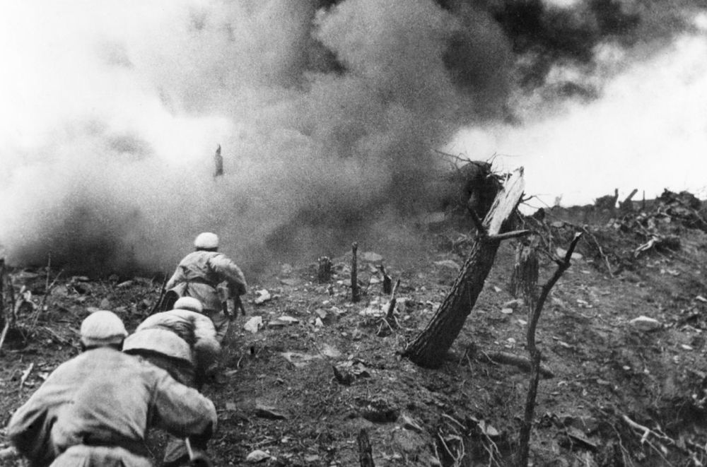 1952年,在上甘嶺戰(zhàn)役中,中國人民志愿軍指戰(zhàn)員在炮火支援下,攻上537.7高地北山。新華社發(fā)