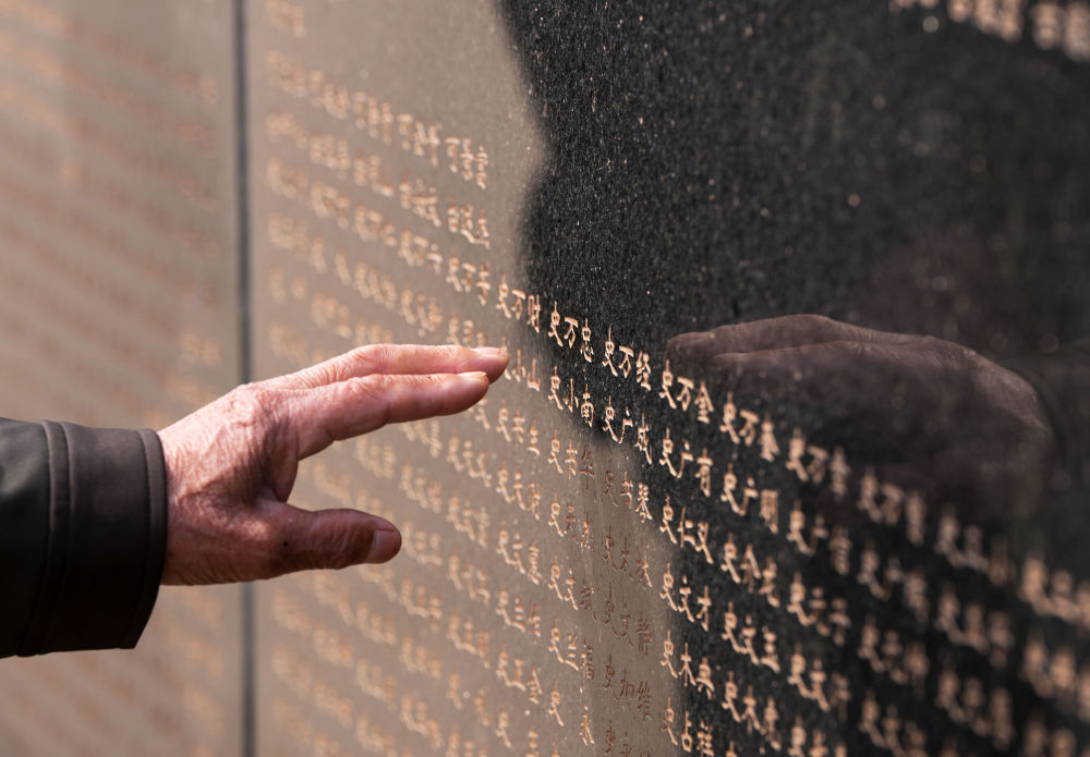 2024年4月3日,在沈陽抗美援朝烈士陵園,史榮升老人手指輕觸刻有父親名字的烈士英名墻。新華社記者 李鋼 攝