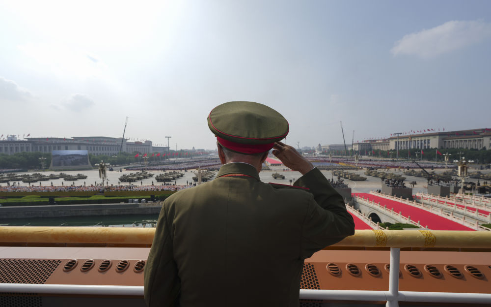 9月3日,紀(jì)念中國人民抗日戰(zhàn)爭暨世界反法西斯戰(zhàn)爭勝利80周年大會在北京隆重舉行。這是觀禮嘉賓在天安門城樓上敬禮。新華社記者 才揚 攝