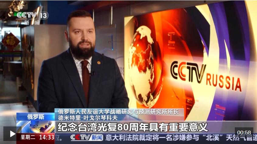 俄羅斯人民友誼大學(xué)戰(zhàn)略研究與預(yù)測研究所所長 德米特里·葉戈?duì)柷倏品颍杭o(jì)念臺灣光復(fù)80周年具有重要意義,象征著中國人民心向統(tǒng)一。戰(zhàn)勝日本軍國主義是世界反法西斯戰(zhàn)爭的重要組成部分,這一歷史應(yīng)該被銘記。