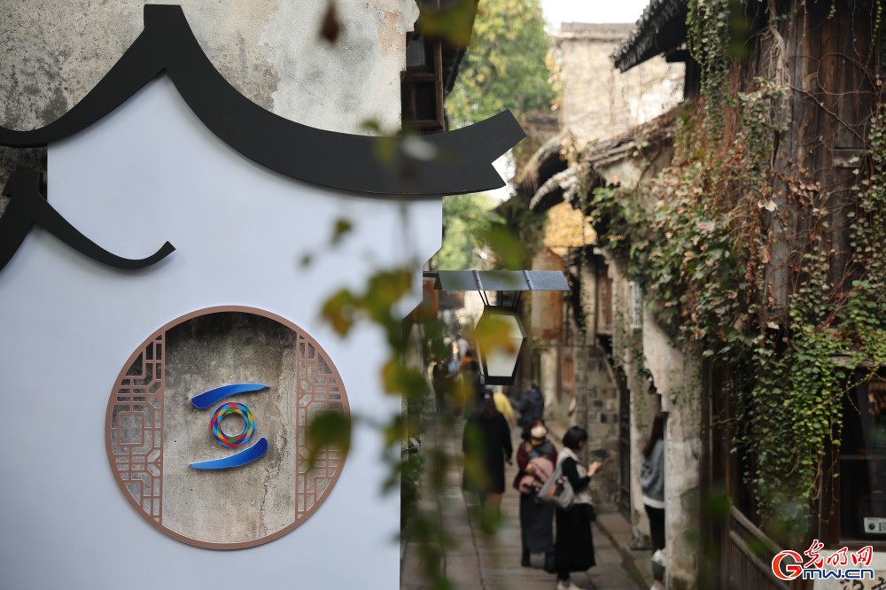 2025年11月5日,浙江烏鎮(zhèn),烏鎮(zhèn)西柵景區(qū)內的烏鎮(zhèn)峰會元素。