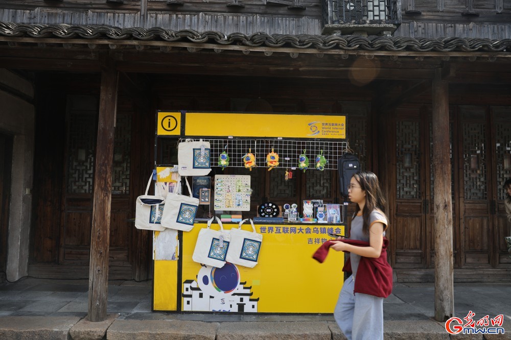 2025年11月5日,浙江烏鎮(zhèn),烏鎮(zhèn)西柵景區(qū)內,游客從烏鎮(zhèn)峰會文創(chuàng)攤位前走過。