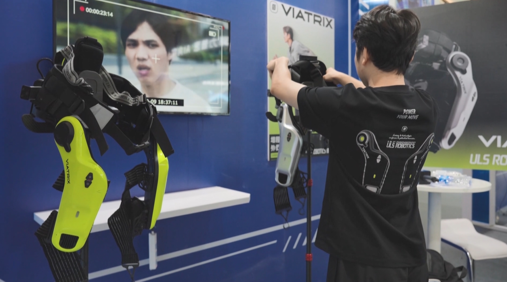 在這家來自上海的科技公司展位,穿上這套增程動力外骨骼機器人,普通人也能有效減輕負重,讓登山、騎行和長時間步行變得格外輕松。