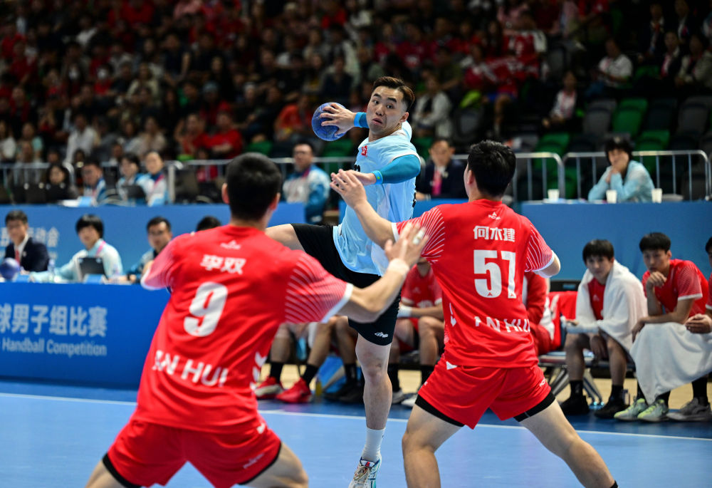 11月8日,在香港進(jìn)行的第十五屆全國運(yùn)動(dòng)會(huì)男子手球半決賽中,香港隊(duì)球員連潤滔(中)在比賽中射門。新華社記者 于洋 攝