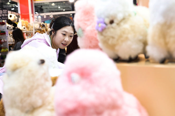 2025年11月8日,在第八屆進(jìn)博會消費(fèi)品展區(qū),參觀者在秘魯溫暖駝品牌的羊駝毛制品前駐足觀看。新華社記者 方喆 攝