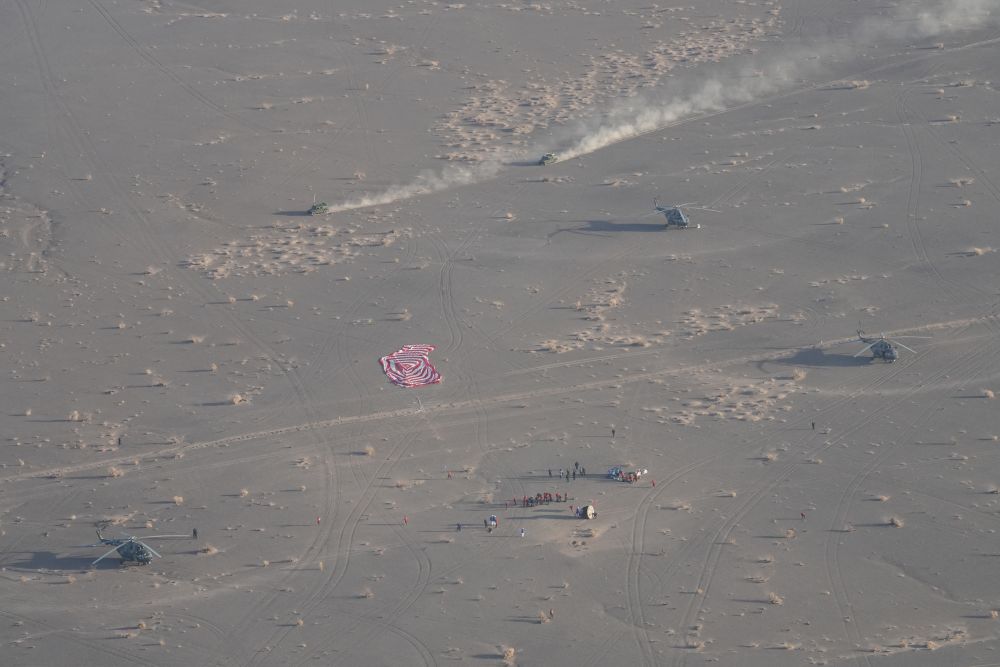14日下午,返回艙主傘打開(kāi)瞬間,酒泉衛(wèi)星發(fā)射中心李斌斌已鎖定跟蹤,實(shí)時(shí)畫(huà)面?zhèn)飨蛑缚卮髲d。空中分隊(duì)、地面分隊(duì)等向落點(diǎn)集結(jié),共同搭建起“空地一體、立體協(xié)同”多維搜救體系。