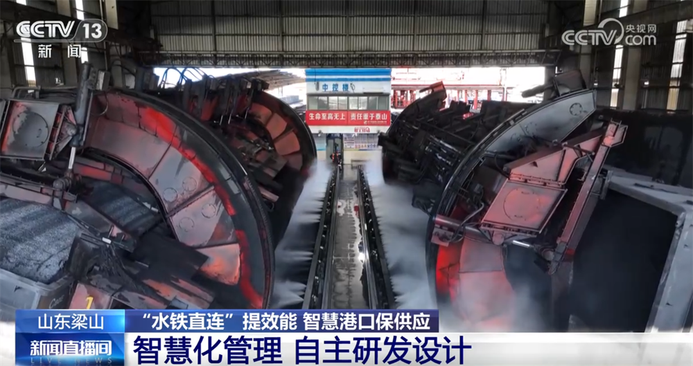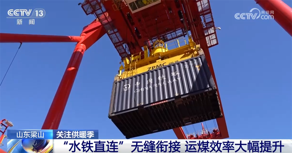 在現(xiàn)場,大家可以看到大型起重機正在往船上裝集裝箱,這是今年港口新推出的一種“水鐵直連”的煤炭運轉模式,就是把集裝箱的煤通過鐵路運到這里,不再經過卸煤和存儲的過程,而是通過精準的需求調度把集裝箱直接裝船,通過運河發(fā)往目的地。這種方式大幅縮短了煤炭運輸?shù)闹芷冢颜麄€周期從5天縮短到3天,也提升了港口能源保障的效率和能力。