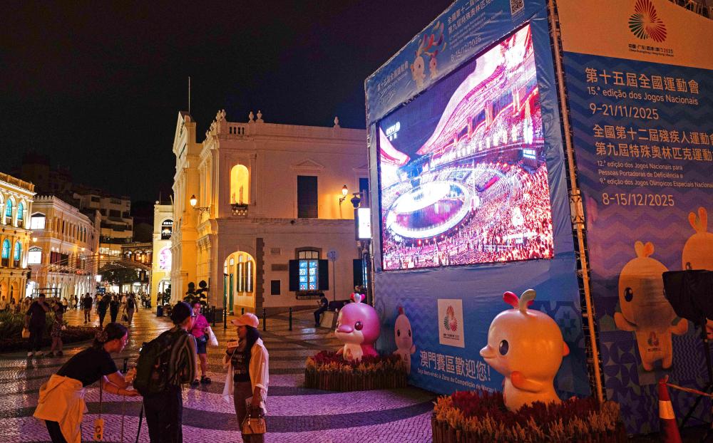 11月9日,群眾在澳門(mén)議事亭前地觀看第十五屆全國(guó)運(yùn)動(dòng)會(huì)開(kāi)幕式直播。