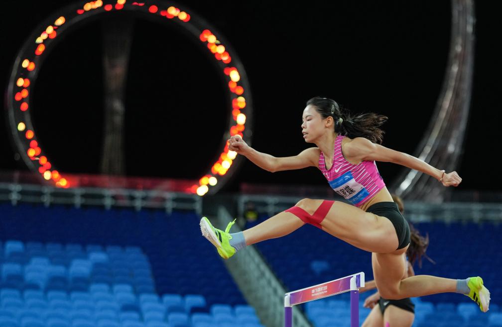 11月17日,廣東隊(duì)選手莫家蝶在田徑女子400米欄決賽中。