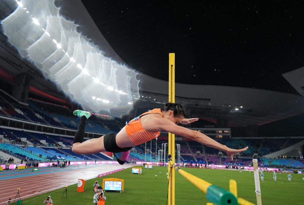 11月18日,浙江隊(duì)選手李玲在女子撐桿跳高決賽中。