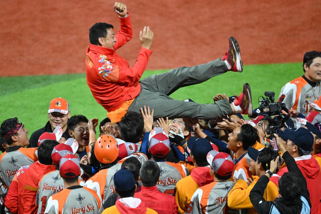 11月20日,江蘇隊(duì)成員在棒球1-2名決賽后慶祝奪冠。