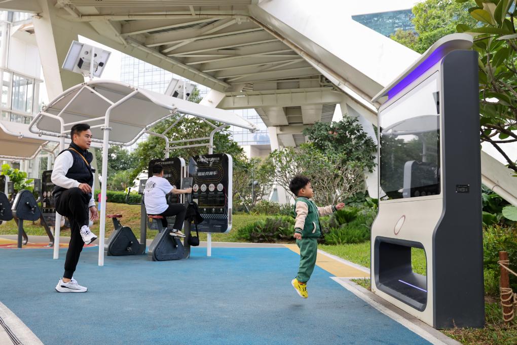 2024年12月27日,在深圳筆架山公園里,小朋友和家長(zhǎng)一起使用智能互動(dòng)屏鍛煉身體。
