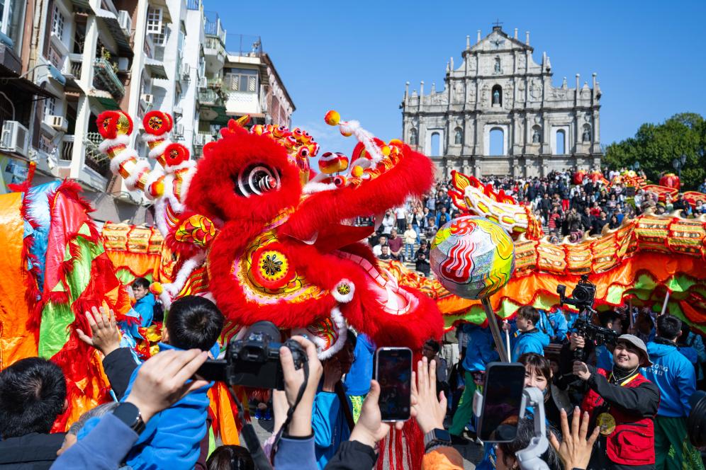 1月30日,演員在澳門(mén)大三巴牌坊前表演舞龍。
