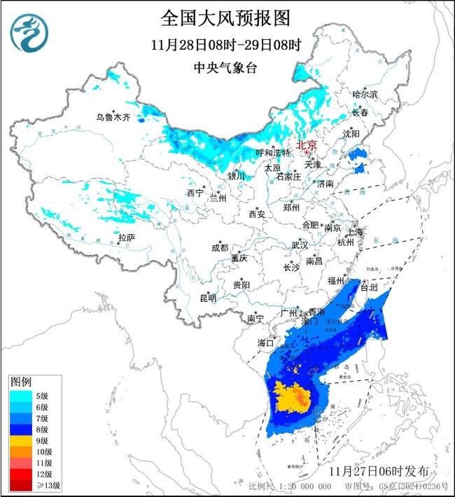 11月28日08時至29日08時,新疆北部和東部、內(nèi)蒙古大部、甘肅北部、寧夏北部、山西北部以及青海南部、西藏北部等地有5~6級大風(fēng),陣風(fēng)7~8級,其中新疆東部山口地區(qū)、內(nèi)蒙古中西部部分地區(qū)風(fēng)力可達(dá)7級,陣風(fēng)8~9級;11月28日08時至29日08時巴士海峽、南海東北部和中部海域?qū)⒂?級、陣風(fēng)9級的東北風(fēng),其中南海西南部海域的風(fēng)力可達(dá)9級、陣風(fēng)10級。