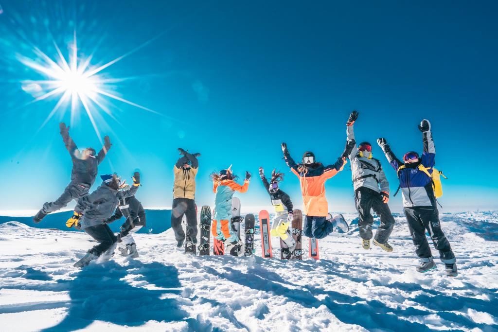 11月26日,可可托海國(guó)際滑雪度假區(qū)內(nèi),滑雪愛好者們從雪地上同步躍起,氛圍歡快,慶祝新雪季的啟幕。(新華社發(fā) 靳冰 攝)