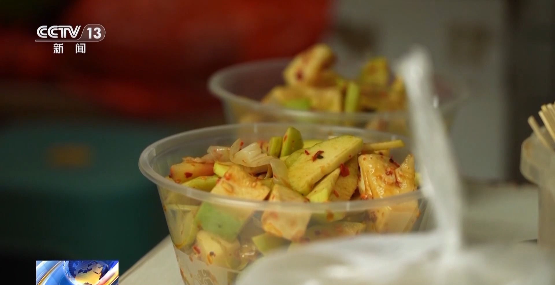 總臺記者 楊雪:街頭巷尾,最具廣西特色的還得是酸嘢,而紅糖酸嘢更是將酸、甜、辣、咸完美融合。將新鮮芒果、菠蘿、番石榴等食材切塊,加入紅糖粉和秘制調(diào)料攪拌均勻,再根據(jù)口味加入辣椒粉,紅糖的蜜甜與水果的清甜結(jié)合,吃起來別有一番風味。
