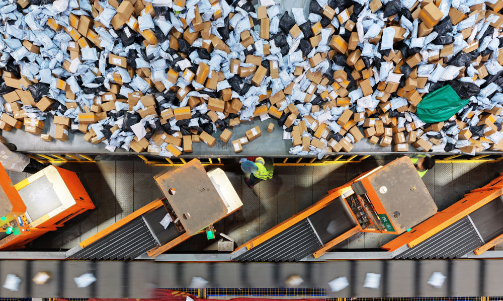 2025年11月10日,在中國(guó)郵政集團(tuán)有限公司江蘇揚(yáng)州郵件處理中心,工作人員分揀快遞包裹(無(wú)人機(jī)照片)。新華社發(fā)(孟德龍攝)