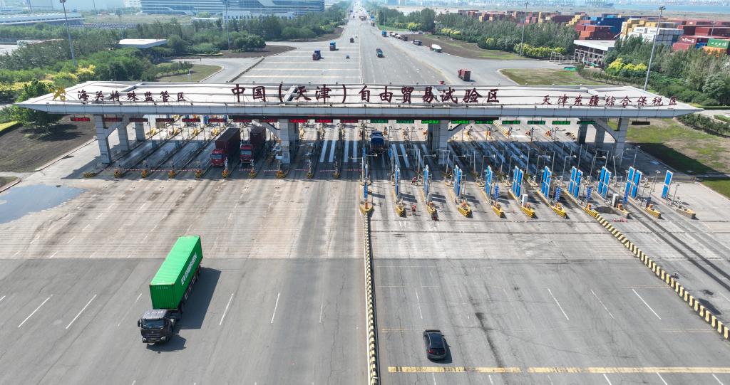 這是6月20日拍攝的天津自貿(mào)區(qū)天津港東疆片區(qū)入口處的中國(天津)自由貿(mào)易試驗區(qū)海關(guān)特殊監(jiān)管區(qū)入口(無人機照片)。新華社記者 孫凡越 攝