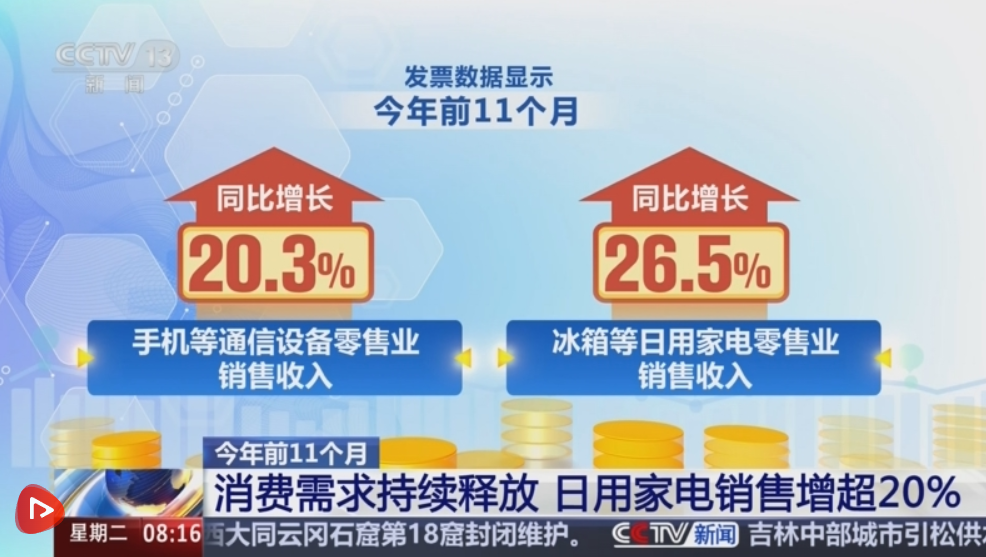 發(fā)票數(shù)據(jù)顯示,2025年前11個(gè)月,手機(jī)等通信設(shè)備零售業(yè)、冰箱等日用家電零售業(yè)銷售收入同比分別增長(zhǎng)20.3%、26.5%。新能源汽車消費(fèi)也持續(xù)向好,新能源乘用車銷售收入同比增長(zhǎng)19.1%。同時(shí),文旅市場(chǎng)新業(yè)態(tài)新場(chǎng)景不斷涌現(xiàn),激發(fā)消費(fèi)活力持續(xù)增強(qiáng)。