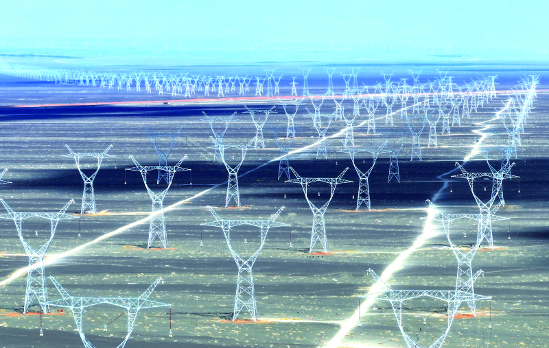 在巴里坤哈薩克自治縣三塘湖鎮(zhèn)附近拍攝的“疆電入渝”特高壓工程。王菲/攝