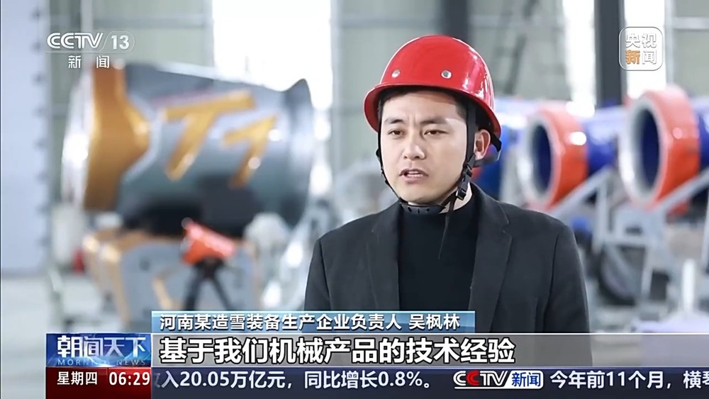 總臺央視記者 杜思源:冰雪產(chǎn)業(yè),從造雪制冰開始,到滑雪場的纜車、壓雪車等設(shè)施,再到我們使用的雪服雪板等等,涉及的門類繁多。推動冰雪經(jīng)濟高質(zhì)量發(fā)展,不同產(chǎn)線的協(xié)作、區(qū)域間的高效協(xié)同,至關(guān)重要。我現(xiàn)在是在河北崇禮的一家滑雪場,距離這里一個小時車程,就是當(dāng)?shù)氐谋┊a(chǎn)業(yè)園。在京津冀地區(qū)的多個雪場,都有來自這座產(chǎn)業(yè)園的冰雪裝備。