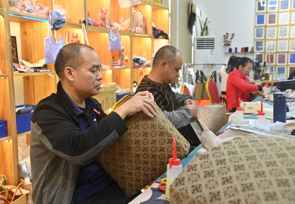 在廣西賓陽壯錦文創(chuàng)館,工人制作壯錦文創(chuàng)產品。廣西賓陽縣有著悠久的壯錦生產歷史。近年來,該縣在傳統(tǒng)壯錦生產的基礎上,積極推動壯錦文創(chuàng)產業(yè)發(fā)展,拓寬了當?shù)貏趧泳蜆I(yè)渠道。新華社記者 陸波岸 攝