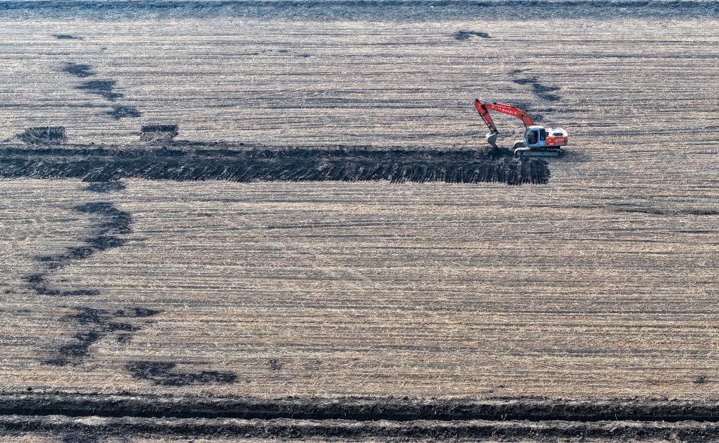 2025年3月11日,在天津市津南區(qū)八里臺(tái)鎮(zhèn)大韓莊村,工人駕駛挖掘機(jī)進(jìn)行高標(biāo)準(zhǔn)農(nóng)田施工作業(yè)(無(wú)人機(jī)照片)。新華社記者趙子碩 攝