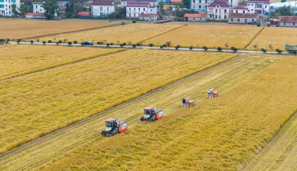 10月30日,在江蘇省南通市通州區(qū)十總鎮(zhèn)育民村高標準農(nóng)田里,村民駕駛農(nóng)機收割水稻(無人機照片)。 新華社發(fā)(翟慧勇攝)