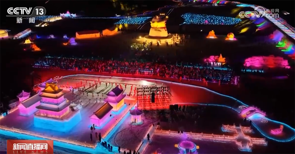臨近零點,一場融合科技光影與民族歌舞的跨年演出在晶瑩閃爍的冰雕舞臺上精彩亮相。
