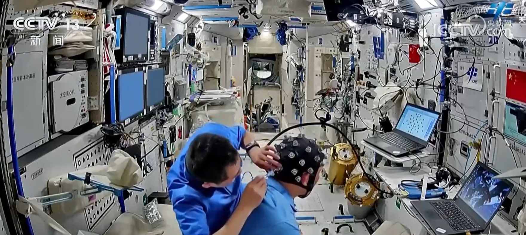 在軌腦電測試研究相關(guān)項(xiàng)目按計劃開展,乘組利用腦電設(shè)備完成了上下視野研究、執(zhí)行功能訓(xùn)練、探索利用研究等多個項(xiàng)目的實(shí)驗(yàn)測試工作;使用近紅外腦功能成像設(shè)備開展空間腦網(wǎng)絡(luò)時變特性實(shí)驗(yàn),通過采集相關(guān)數(shù)據(jù),開展長期空間飛行環(huán)境對航天員腦功能網(wǎng)絡(luò)影響及大腦對外部環(huán)境變化進(jìn)行了自發(fā)調(diào)整與適應(yīng)機(jī)制研究。