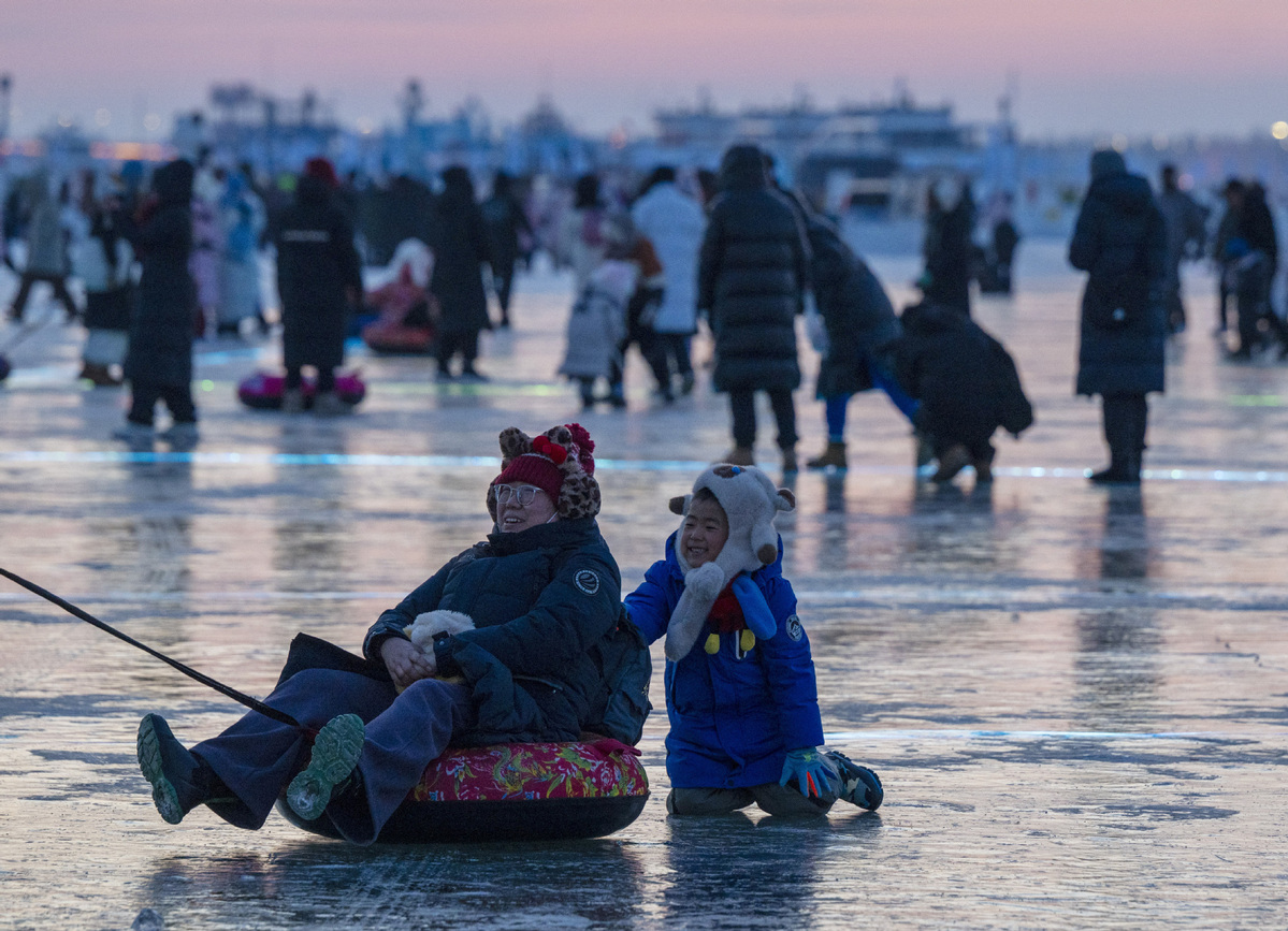 1月2日,人們在第八屆哈爾濱松花江冰雪嘉年華園區(qū)內體驗冰上娛樂項目。(圖片來源:新華社)