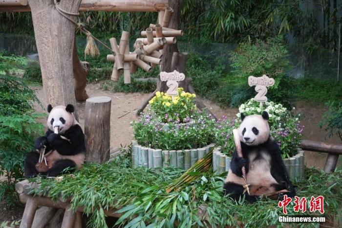 2025年7月7日,在韓國誕生的雌性大熊貓雙胞胎“睿寶”和“輝寶”迎來兩周歲生日。位于韓國龍仁的愛寶樂園為它們舉辦慶生活動。圖為大熊貓“睿寶”(左)和“輝寶”在生日會上。