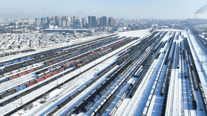 裝滿物資的貨運列車在黑龍江省哈爾濱南站編組站場整裝待發(fā)?!叭拧碧煲詠恚槍Ρ狈浇禍亟笛┨鞖?,中國鐵路哈爾濱局集團有限公司哈爾濱南站積極開展電煤、生產(chǎn)物資保供專項行動,全力保障民生物資運輸需求(2026年1月15日攝,無人機照片)。新華社發(fā)(原勇 攝)