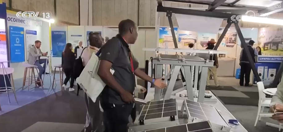 這個(gè)新能源產(chǎn)品可以說是非常具有非洲特色,它的上面是兩片光伏板,下面是兩個(gè)可以調(diào)整角度的攝像頭,用光伏發(fā)電來支持?jǐn)z像頭的運(yùn)行,還有把路燈、攝像頭和光伏結(jié)合在一起的。