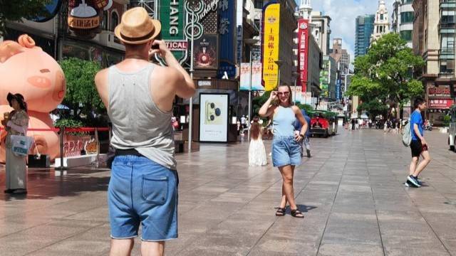 題圖來(lái)源:2025年夏天,外國(guó)游客在南京路步行街上留影。