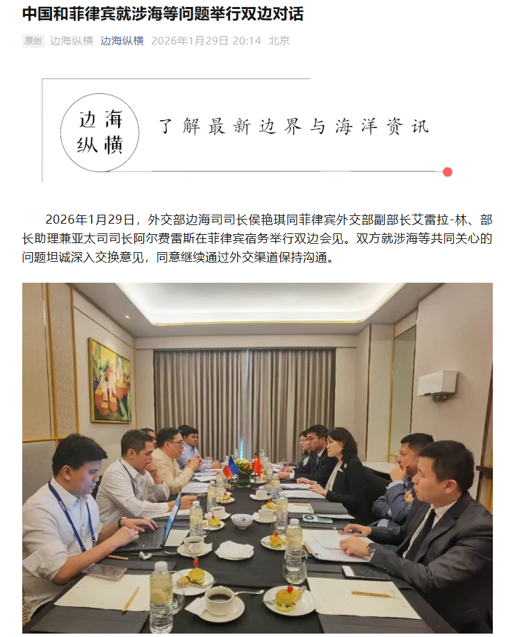 2026年1月29日,外交部邊海司司長侯艷琪同菲律賓外交部副部長艾雷拉-林、部長助理兼亞太司司長阿爾費雷斯在菲律賓宿務舉行雙邊會見。雙方就涉海等共同關心的問題坦誠深入交換意見,同意繼續(xù)通過外交渠道保持溝通。