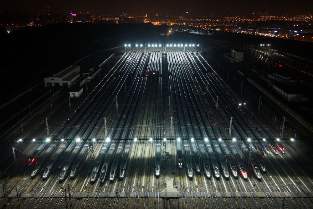 2026年2月2日凌晨,檢修完的動(dòng)車組列車??吭陂L沙動(dòng)車運(yùn)用所(無人機(jī)照片)。新華社記者 陳思汗 攝