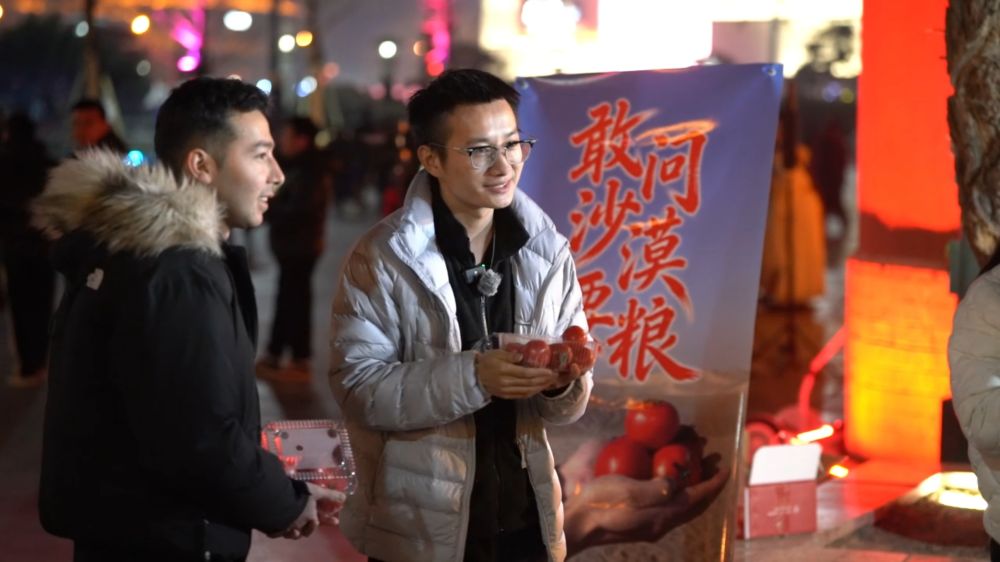 陳鎮(zhèn)和他的朋友阿迪力·阿卜杜熱合曼在西安大唐不夜城推廣“喀柿紅”