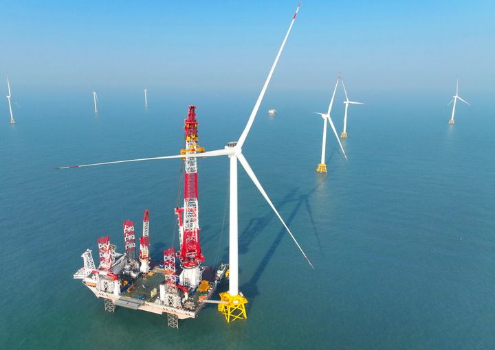2026年1月13日在福建閩南海域拍攝的“大橋海風(fēng)”號2000噸自升式海上風(fēng)電安裝平臺和20兆瓦風(fēng)電機組吊裝現(xiàn)場(無人機照片)。