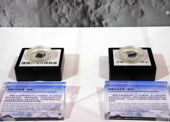 2025年11月5日在第八屆進博會國家展中國館拍攝的“嫦娥五號”月壤和“嫦娥六號”月壤。