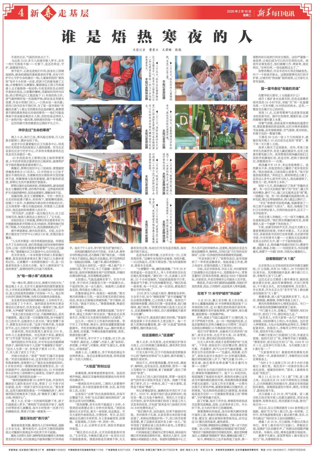 春節(jié)前夕,記者走進他們中間:醫(yī)務(wù)社工將精油搓熱,俯身輕揉臨終重病患者的手臂,在安寧療護中心守護生命的最后一程;兒童福利院的“黃媽媽”每半個小時查一次夜,把孩子們的被角掖了又掖;小巷餐館燈火闌珊處,餐廚清運工得工作到凌晨3點才能換得一街潔凈;冬夜里消防員必須把外套放在枕邊,以備警鈴驟響,用最短時間沖向兇險;熱力管網(wǎng)運行工爬進地下11米深的熱力井,屏氣凝神傾聽每一絲細微聲響;驛站里總有暖光亮著,外賣小哥推門而入,一口熱水祛一身風(fēng)霜;胡同口的書店舍不得打烊,為了留一屋書香給“有趣的靈魂”;1路公交的乘務(wù)員也是講解員,載著想看升旗的乘客奔赴長安街的黎明……他們可能是寒夜中容易被忽略的小人物,但恰恰是這樣的人以一身熱汗抵一路風(fēng)寒,焐熱城市的每一個角落。