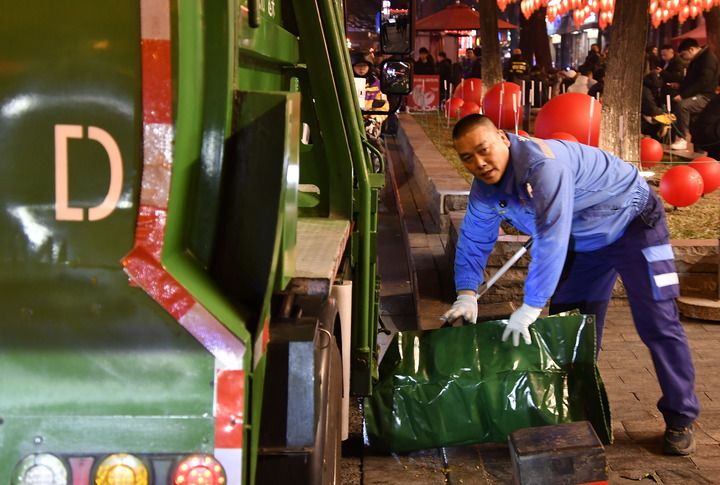 2月4日,在簋街清運多年的李寧,裝運完垃圾后清理環(huán)境。新華每日電訊記者李欣 攝