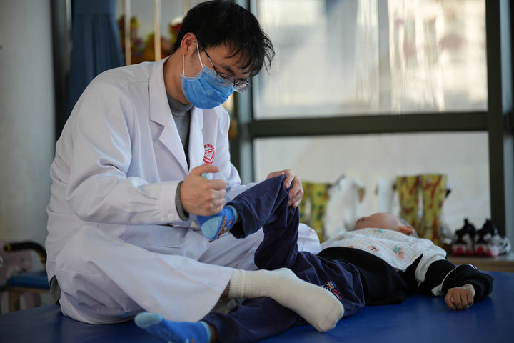 2月5日,一位福利院的老師正在給孩子進行肢體康復(fù)訓(xùn)練。新華每日電訊記者謝晗 攝