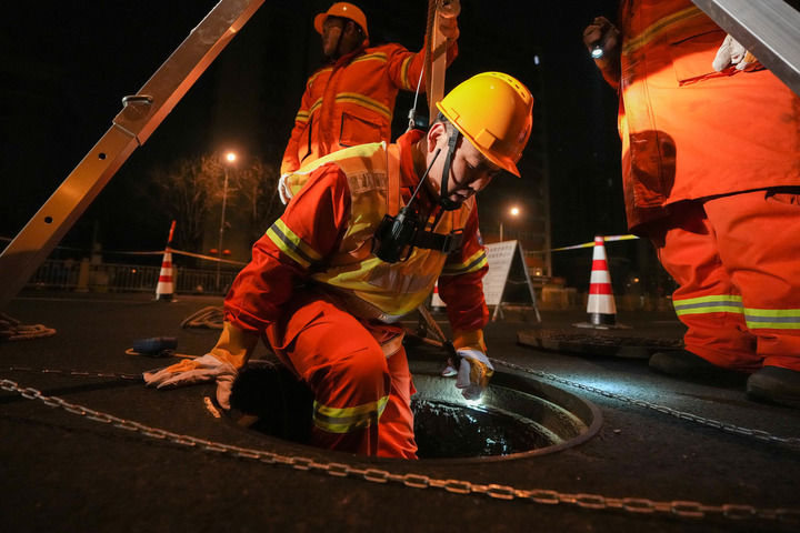 白天人多車密,深夜才是管網(wǎng)維護的“主戰(zhàn)場”。下井前,班組在井口拉好警示帶,擺好反光錐。井蓋掀開,熱氣與冷空氣凝成薄霧。按照安全作業(yè)的鐵律——“先通風(fēng)、再檢測、后作業(yè)”,班組先是對小室進行30分鐘通風(fēng)置換,隨后將檢測儀探入井下:“氧氣含量20.9%,一氧化碳、硫化氫和易燃易爆氣體含量均為零——合格!”