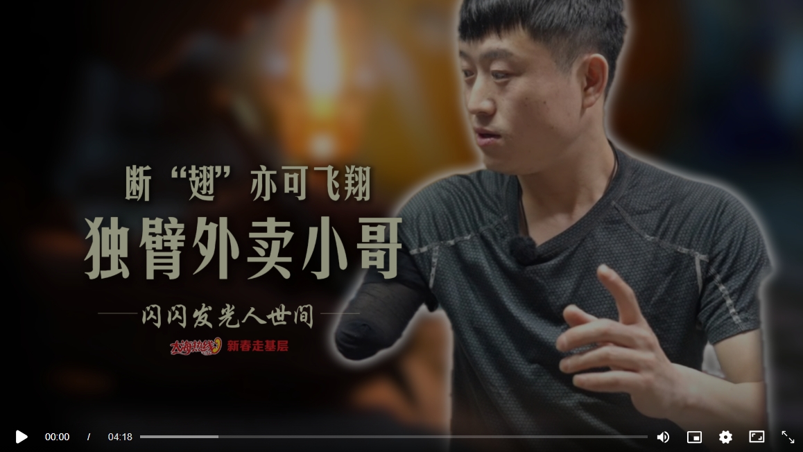 18歲意外失去右臂,不向命運(yùn)低頭,單手騎車、送餐、爬樓,憑著樂(lè)觀和韌勁,風(fēng)雨無(wú)阻跑遍阜新街巷。每天工作12小時(shí)、日均配送60單、爬樓100多層、騎行100多公里……